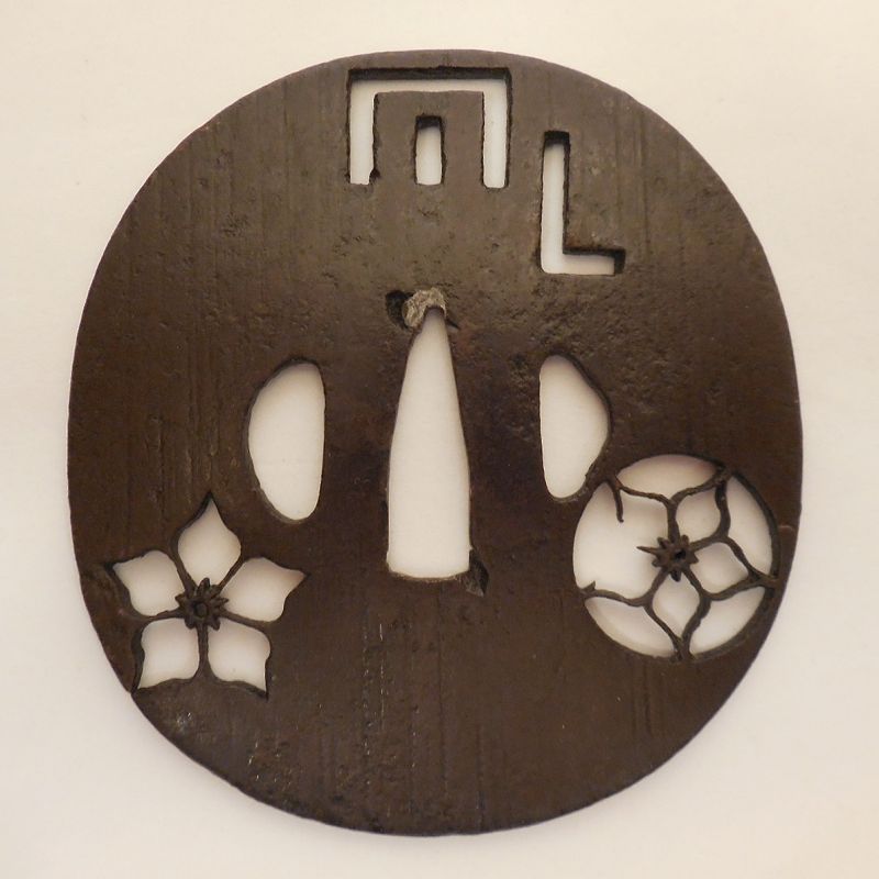 The Katchushi style of this tsuba gives it an earlier look and feel. But it is probably an Edo period work (might expect more wear on the seppa-dai or more conspicuous tekkotsu on an older example.) The thin body nonetheless resilient. Strong, sparse, decorative file marks on the vertical add to character. Adept use of the file, thin plate and slight taper toward the rim could support argument a swordsmith may have made the tsuba. Genji style mon and two five petal blossoms in fine open work (some iron detailing missing from one of the blossoms, the other with one of the open worked petals interrupting the rim.) Smaller kozuka-ana and kogai-ana flanking the seppa-dai. The surface smooth to the touch despite some old, light pitting. Possible scant old lacquer adhering closely to the surface (difficult to discern with certainty as some hard wax appears to have been applied to the surface.) Simple sukashi tsuba are considered by many to be closest to Samurai taste. Fine open work and subtle attention to detail such as the file work add to appeal. Length, 3 9/32 inches (8.33 cm). Width, 3 1/16 inches (7.78 cm). Thickness, about 3/32 inch (0.238 cm)