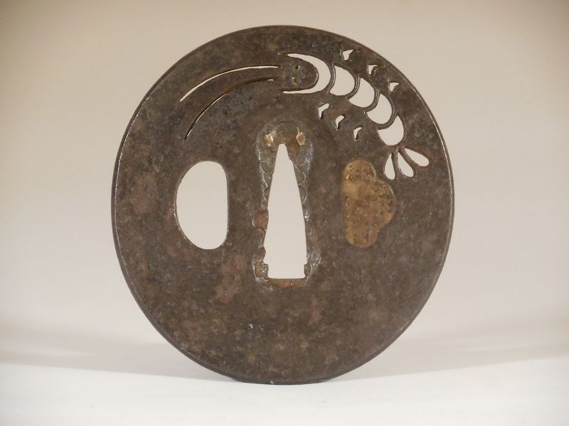 An armorer's tsuba, with very slightly raised rim on the strong, flat iron plate. Pierced decoration of a shrimp with pleasing, subtle swell along the antennae and legs (mostly on the ura.) Small, irregular brass inlays for the eyes (missing from one eye - not conspicuous.) The kogai-ana plugged with a copper rich alloy. Oval form about 2 7/8" (7.3 cm) by 2 3/4" (6.985 cm). Thickness at rim about 5/32" (.39 cm). Late 16th century to early 17th century - perhaps Momoyama period. Or possibly earlier with hitsu-ana added (though old). Good condition with varieagated hues in the dark, lustrous patina likely with extant lacquer adhering and accounting for some of the black color (note that the tsuba has an overall dark, mottled patina which our lighting doesn't adequately portray). Subtle tekkotsu evident - some old, worn pitting with the surface now smooth, almost soapy to the touch.