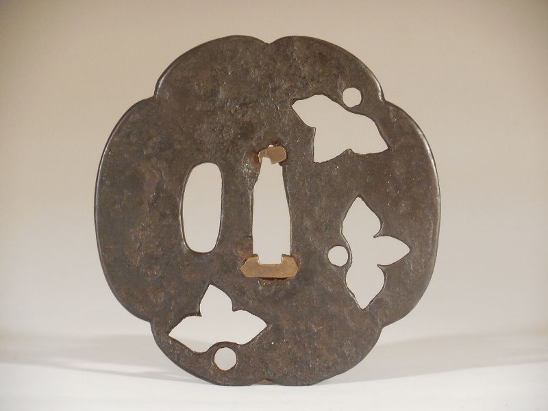 A katchushi mutsu-gata sukashi tsuba. The six lobed, thin plated armorer's tsuba with good tekkotsu and with openwork decoration was described by Skip Holbrook (ex collection) as Saotome made and depicting three birds. The Saotome were a line of armorers (katchu) turned tsuba makers. But I think a case could be made for the sukashi decoration being a wabi-sabi flower bloom or possibly paulownia leaves (rather than awkward looking "birds".) Use of the paulownia (kiri) mon could suggest Yamakichibei as those tsuba makers, from Owari, were outfitting swords for the Oda and the Toyotomi - the latter using the kiri ka-mon. Good condition. 2 7/8 (7.3 cm) inches x 2 13/16 (7.14 cm) inches