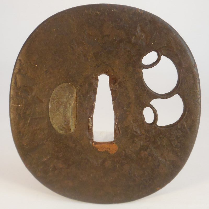 A large Tembo tsuba. The Tembo (or Tenpo) style evolved from the Saotome school and the sukashi decoration of Okiagari here (an especially nice feature) carries over. Okiagari are self righting toys and the subject was a symbol of inspiration to Samurai in aspiring to improvement and the right path in life. There is, on a curious level of interest, some minute trace of old gold decoration (long since worn off) on the surface of this tsuba. Though there are transitional examples, the present example has a drier feel more typical of Tembo iron (Saotome examples having a smoother, wetter feel.) The kozuka-ana plugged with, apparently, pewter. Edo period. Good condition with one small scratch (should be easily treatable.) Height 3 3/8 inches (85 cm), Width 3 3/16 inches (81.5 cm), and 5/32 of an inch (4 cm) thick.