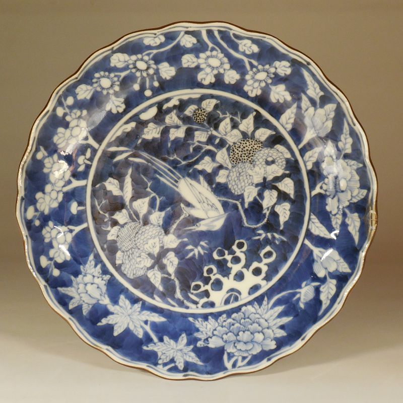 A fine Japanese blue and white porcelain dish. The foliate rim with chocolate brown glaze, the white porcelain body and glaze, and the fine attention to detail all suggest Kakiemon type. The cavetto with decoration of flowering plants including peonies, prunus and others. The center decorated with a bird (perhaps a flycatcher) in fruited branches, rockery and bamboo leaves below. Both the cavetto and center with reverse technique where the underglaze cobalt blue forms the background of the decoration. Finely defined chatter marks inside the footrim centering five spur marks. Remnants of an old label adhere to the back. The decoration has the feel of Chinese inspiration. Emulation of traditional Chinese porcelain decoration, and certainly Chinese porcelain marks, is not without basis. I have not come upon quite this decoration before and would consider it, along with the quality of this work, to be rare and early - probably Genroku era. One hairline issues from the rim where a flake on the front has an old repair, otherwise good condition. This dish would be an excellent candidate for a proper kintsugi (gold lacquer) repair. Diameter 8 7/8 inches (22.5 cm), Height 1 1/16 inch (2.7 cm).