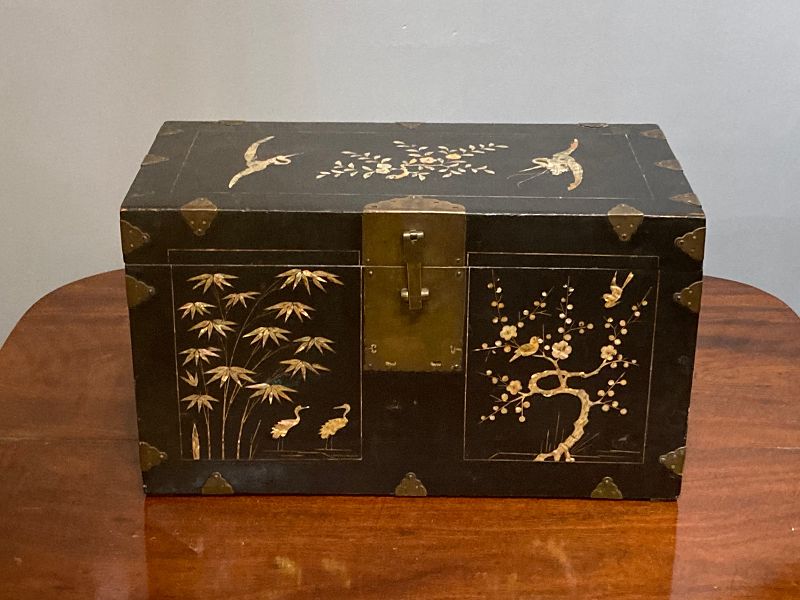 A large Korean black lacquered wood box with mother of pearl inlay. The depiction of pairs of cranes and songbirds within the decorative panels likely relevant to a wedding gift.. Joseon dynasty, 19th century. Condition is fair to good, with some some light loss to inlays and minor distress from age and use. From the hardware, 19 1/4 inches wide, 10 1/8 inches deep, 10 3/4 inches high.
