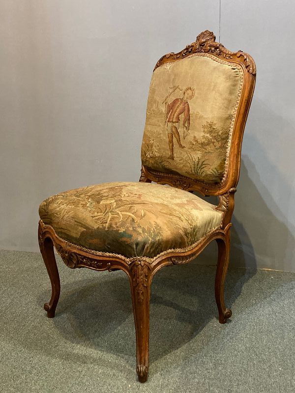 A finely made and carved Louis XV style side chair, 19th century. Upholstered with fragments from an 18th century hunt themed tapestry. A charming and atmospheric interior accent. The chair in good, serviceable condition with expected wear. The upholstery simply divine - showing it’s age with conservation preserving its decorative impact. Seat height, about 18 inches. Back height about 38 1/2 inches.