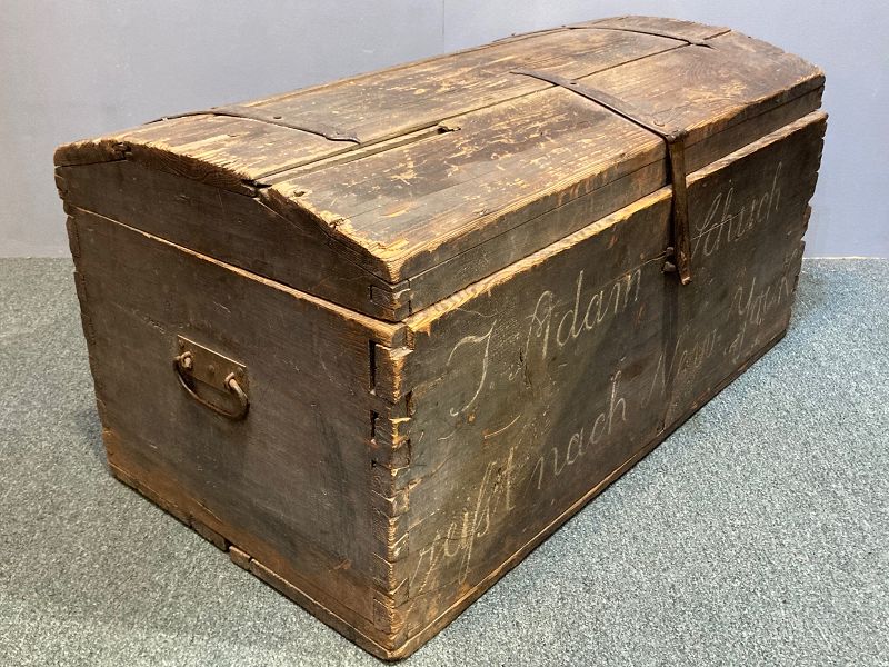 A German, domed top chest with ornamental hand wrought iron hardware, heavily oxidized and worn original surface and paint, and marked in white “T Adam Schuch reifst nach New York”. The chest looks like 17th century work. The name and destination likely added in the 18th century upon immigration. Reasonably good decoration considering the history. Length, 35 inches. Height, 17 1/2 inches. Depth, 18 1/2 to 19 inches (varying due to movement of the wood at the joinings).