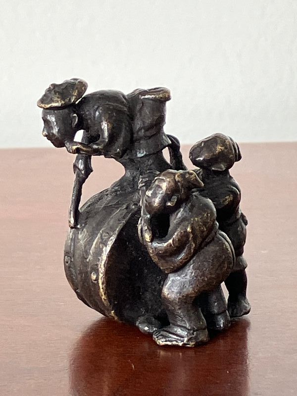 A scarce and nicely formed bronze netsuke. The sculptural group depicts festival musicians playing a Taiko drum and Shinobue flute - the drum player with mask pulled back. Nicely detailed, down to the fingers and expressions of the musicians. The himotoshi is formed by the extended arm of one figure supporting the figure atop the Taiko. Edo period, 19th century. Good condition with rich, natural patina. Height, 1 5/8 inches