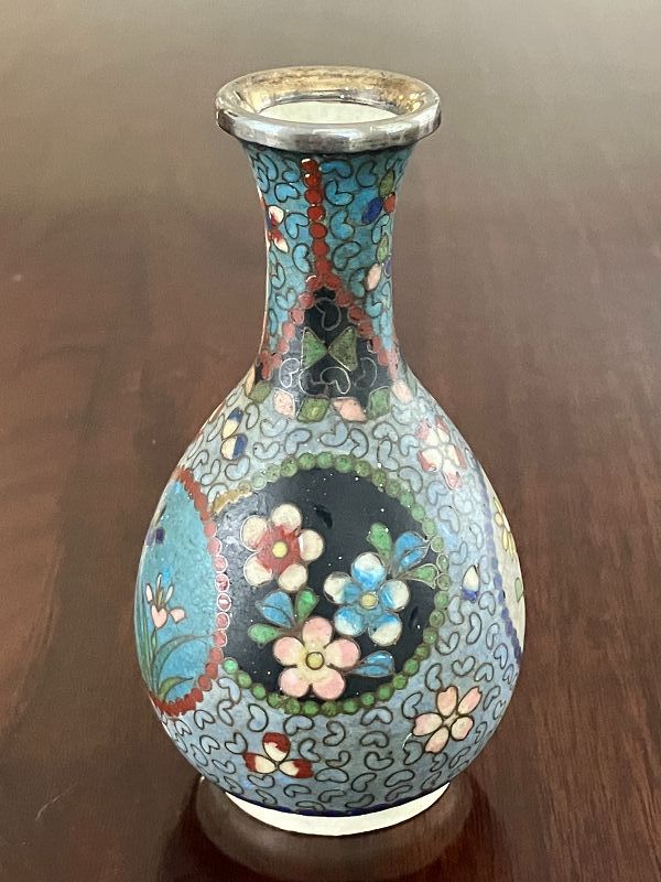A Japanese totai cloisonne (on ceramic body) bottle vase. Blue, white, rose, green, red and yellow enamel decoration of flowers. A silver rim encasement original to the vase. Good condition. Height: 5 inches