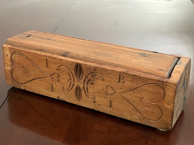 A fine and rare Pennsylvania Dutch Amish folk art candle box carved from a single piece of yellow pine (no joining at all). The interior hollowed and the interior sides hand planed. One side with bas relief carved hex motifs. The other side with the initials, IF and IB (if read left to right, though not sure of the intended order), likely of a married couple and with other carved and incised adornment including hearts. Fitted, sliding top (the only exception to it being wholly one piece). Possibly a wedding gift. At least 19th century and possibly 18th century. In addition to the distinctly Dutch Amish carved decoration, yellow pine is typical of the Pennsylvania home to the community - used extensively in furniture of the region. Wonderful, lovingly used condition with undisturbed patina. Very good condition with expected wear and natural checking along the wood grain. Length, up to 15 1/4 inches at the longest points (with variation to about 15 inches at points)