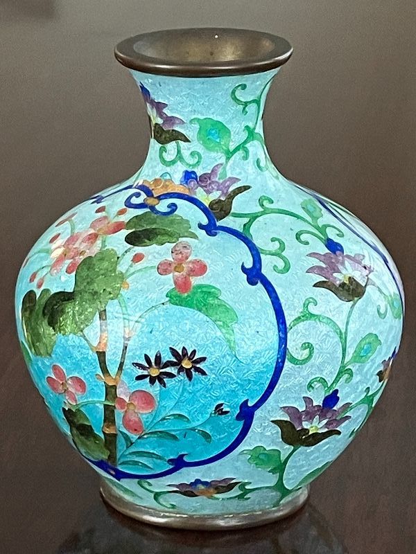 A fine, small ginbari cloisonne vase with pale blue, silver background and peonies decoration; one panel with pale purple background and bird, bamboo and flowers decoration; and another panel with blue background and flowers decoration. Impressed artist's mark on the metal base. Meiji period (1868 - 1912). Good condition with tiny, oxidized pinholes in the enamel surface from the firing (not detracting from condition or presentation). Height, 3 1/2 inches (8.9 cm)