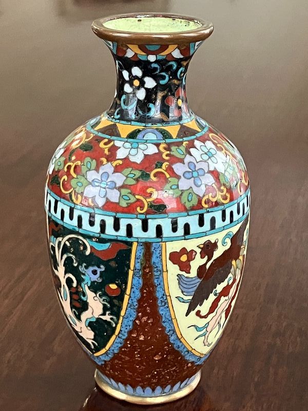 A good, small Japanese cloisonne vase. The alternating dragon and phoenix chevron panels symbolize harmony and balance. Lots of engaging, balanced color. Sparkling goldstone embellishment technique demonstrated in backgrounds below the shoulder and in decorative details around the waisted neck. Ginbari (enamel over silver foil) technique demonstrated around the shoulder with opaque sakura and karakusa decoration floating over the clear red background offset by the underlying foil. It's one of those seemingly simple objects that is immediately, visually alluring and then even more captivating as the multiple techniques and attention to detail is appreciated. Meiji era (1868 - 1912). Very good condition. Height, 4 13/16 inches (12.22 cm)