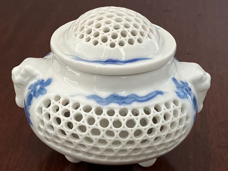 A Hirado blue and white porcelain censer with pierced lattice work cover and sides. Lion masks in relief on opposing sides. Decoration of aromatic flowers and wisps of burning incense. Three feet elevate the censer above surfaces. Early Showa period. Good condition. Lion mask to Lion mask nearly 4 inches in length. Height, covered, just over 3 inches.