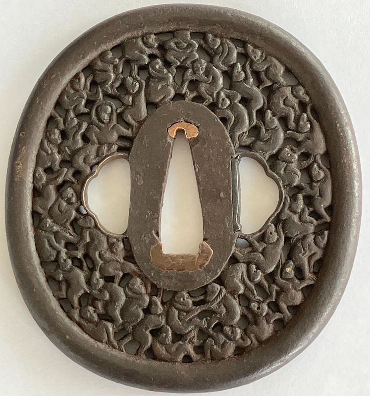 A copper alloy (sentoku) example in The Metropolitan Museum of Art posits the motif as “108 human sins in the guise of monkeys” (46.122.77). Signed Hishū Yagami-Jū Mitsuhiro, it and other examples include a silver alloy (shibuichi) tsuba in The Walters Art Museum (from Noda, rather than Yagami, in Hizen province) signed the same (51.133), a second (unsigned and in the nanban manner with patterned seppa-dai) in the Walters has a mimi surrounding the open worked plate, an iron nanban tsuba in the Seattle Art Museum (37.44), a photographed iron nanban tsuba in the J. Paul Getty Museum (56538), and an iron tsuba in the Museum of Fine Arts Boston signed Yagami Shoyoken Mitsuhiro (13.1769).