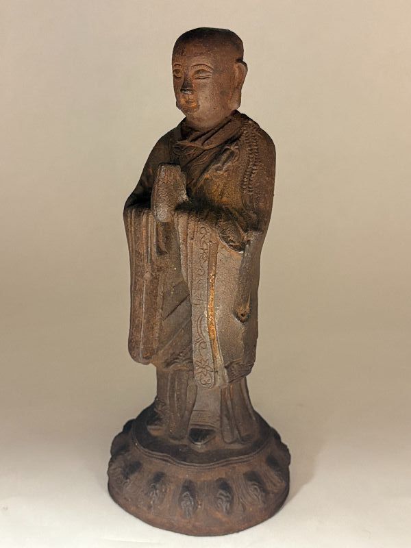 This Chinese, Ming dynasty figure of Dizang (in Sanskrit, Ksitigarbha), often depicted as a monk, is cast in iron. Details are finely carved into the surface including decoration of the lotus base, trim and elements of the jiāshā (robe), and the figure's facial features. At least three small iron pins and one pin hole remain at inconspicuous points, attesting to the casting process (look for these in the last two enlargement images). As it is iron, there is an even coarseness to the surface which would have been anticipated, and intended, by the artisans. An inconspicuous stress line behind the fold of the right sleeve probably coincides with the casting. It is in good condition with no corrosion and with a coarse, natural ferrous patina. Height, 10 3/4 inches. Ex Robert K. Berg collection, Ex Peter L. Rosenberg collection, Ex Robert K. Berg collection (having been reacquired from the estate of Peter Rosenberg, Vallin Galleries)