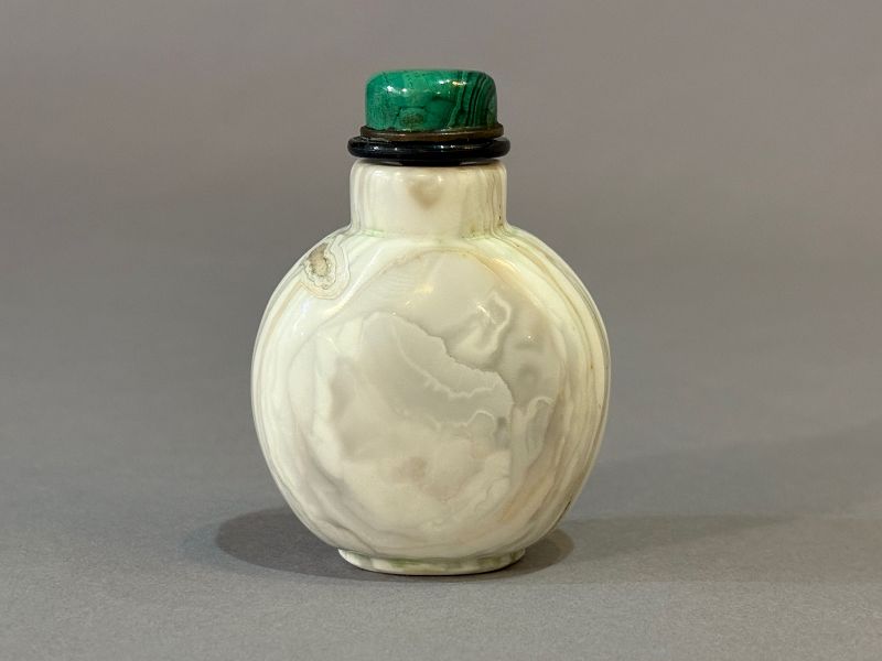 A fine, small, late Qing dynasty agate snuff bottle. Mostly shades of white with subtle warm earth tones appearing within variegated structure. Well defined foot, very slightly concave top, well hollowed interior. A malachite stopper top. Ex Don Elder. 2 inches high bottke only, 2 1/2 inches with the stopper