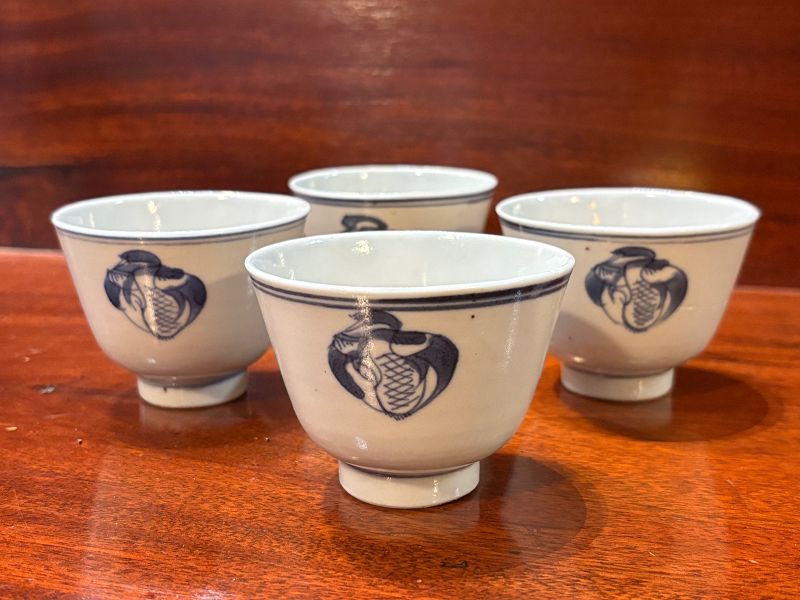 Four Chinese blue and white porcelain wine cups. Each with double ring around the rim, crane motif three times around the circumference, single ring atop raised foot, and mark on the base. Slightly sugary, opaque glaze associated with Kangxi production. Certainly Qing dynasty. Three in good condition. One with crack from rim. Each, diameter about 2 7/8 inches and height about 2 1/8 inches.