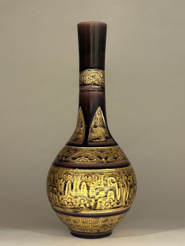A fine Meiji or Taisho period Eiraku kiln aubergine glazed porcelain vase. Rubbed gilt enamel highlights over archaistic relief decoration in manner of the Eastern Zhou dynasty or Western Han dynasty. The vase, with base reminiscent of the Hu form but with elongated neck, harmoniously combines modern and ancient design sense. The blank apparently two symmetrical halves, joined (see closeup images revealing raised glaze where a seam might be). Eiraku seal mark on the foot. Good condition. Height, 9 7/8 inches.